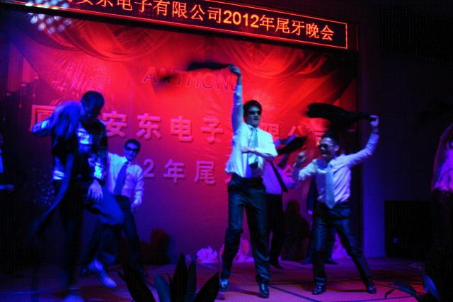 每年的尾牙晚會(huì)都是安東同仁期待的盛會(huì),我們?cè)谶@個(gè)舞臺(tái)慶祝收獲,歡歌笑語;我們這這里展示才藝,妙舞輕歌;我們這這里釋放激情,同慶付出;我們這這里共敘緣分,滿懷感恩!晚會(huì)上的每個(gè)節(jié)目都有鮮明的特色,活力動(dòng)感的現(xiàn)代舞《roly poly》,在黑暗中絢麗多姿的熒光舞《夜光魅影》,婀娜多姿、舞姿飄逸有田園風(fēng)格的《茶山情歌》,霸氣十足的帥氣《安東style》。語言類節(jié)目也難得的好評(píng)如潮,《超幸福鞋墊》讓你覺得仿佛坐在電視機(jī)前聽購物頻道主持人如數(shù)家珍,又似乎看著央視春晚的搞笑小品。還有源于生活、體現(xiàn)百態(tài)的自創(chuàng)小品《賣切糕》,一氣呵成的創(chuàng)作編排,不斷拋出的笑點(diǎn),專業(yè)的角色演出都成就了經(jīng)典... 不論是朝氣蓬勃還是成熟穩(wěn)重,所有的同事都英姿颯爽,在舞臺(tái)上表現(xiàn)得酣暢淋漓。