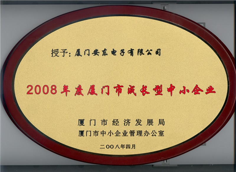 為實施“廈門市中小企業成長工程”,鼓勵和扶持符合國家產業政策并極具成長性的中小企業發展,來自廈門市經發局、財政局、銀監局、國資委和各行業協會等部門的領導、專家組成的評審團,對全市6萬多家中小型企業,經過申報、初審、終審、公示等四個環節,歷經半年的時間,終于產生161家“2008年度廈門市成長型中小企業”。廈門安東電子有限公司位居榜首,這是繼去年(2007年)公司獲該殊榮后又再度榮獲此榮譽,更加突顯了安東公司極具發展后勁的自主創新高新技術企業。